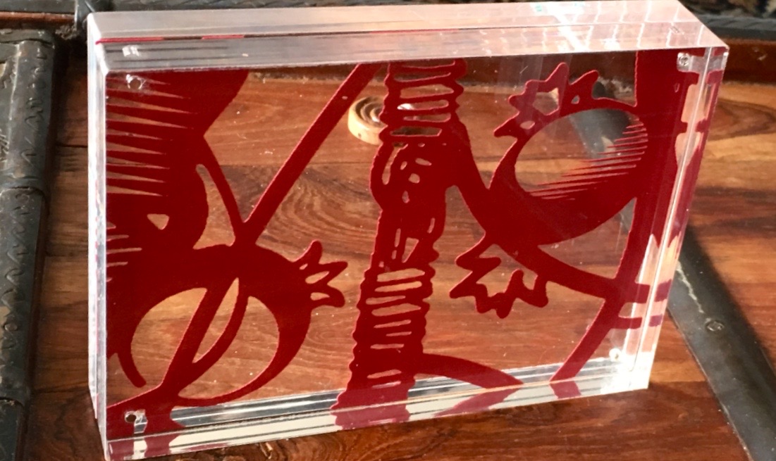 The paper cut is framed by sandwiching it between 2 polished blocks, which are held together by strong durable magnets.